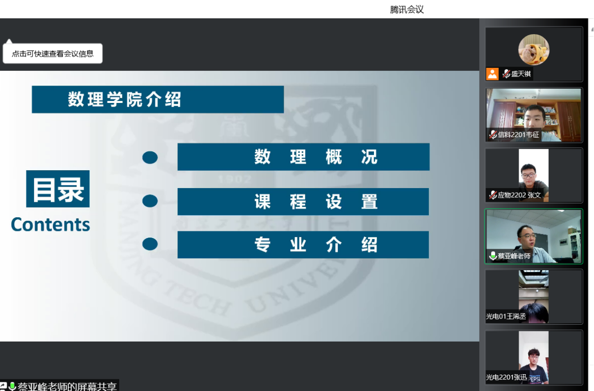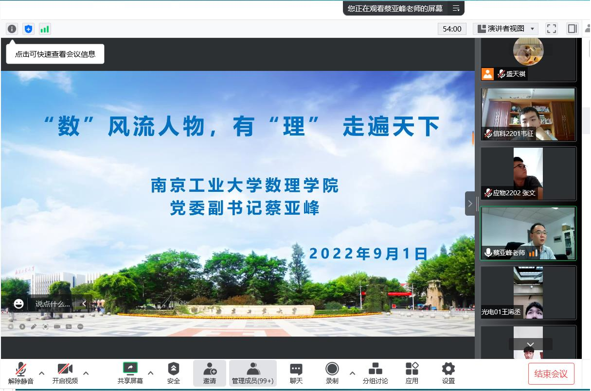 阅读次数: 发布时间:2022-09-02 更新时间:2022-09-029月1日下午,公司党委副书记蔡亚峰老师为全体2022级新生进行“‘数’风流人物,有‘理’走遍天下”的校情及院史院情教育,2022级全体新生通过腾讯会议在线参加。