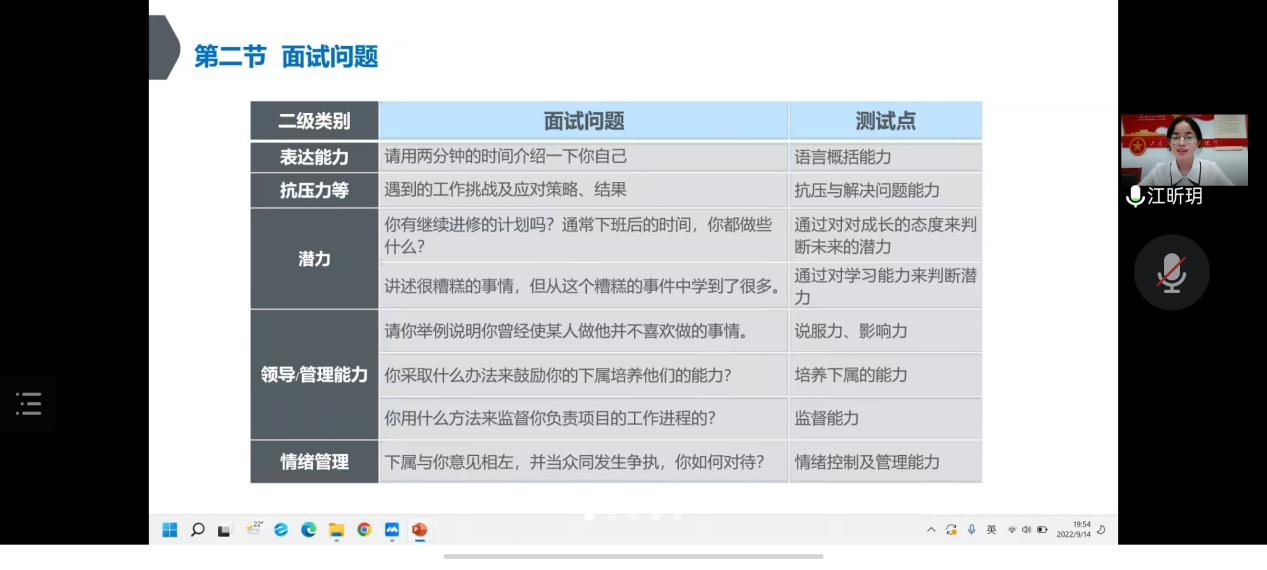 江昕玥老师首先从常态化疫情防控下高校毕业生就业形势、就业相关政策、公司2022届毕业生去向落实情况等方面具体分析了公司毕业生的就业形势,并根据岗位时间轴对同学们提出了相应的建议。随后,江老师从自身及部分同学的求职经历,为同学们分析了面试的技巧和求职礼仪的重要性,向大家详细介绍了个人简历的制作方法和求职礼仪等相关内容,为同学们线上答疑解惑。最后,江老师就太阳集团智慧就业服务平台进行介绍,全面展示了该平台的各项功能,为同学们讲解获取就业信息的各种途径,梳理了就业过程中需要注意的细节,内容丰富,干货满满,并希望公司2023届毕业生能够把握好秋季求职“黄金期”。