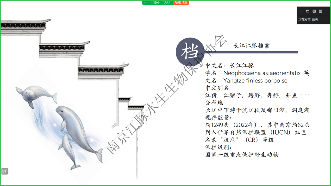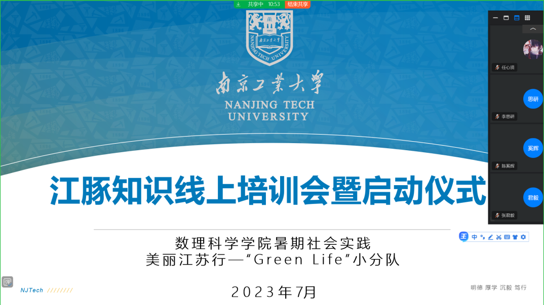 阅读次数: 发布时间:2023-07-21 更新时间:2023-07-21学习二十大,永远跟党走,奋进新征程,72779太阳集团"Green Life"小分队之江豚护卫队开展江豚知识线上培训会暨启动仪式。14日下午,队员们准时参加线上会议,负责人赵艺舟向队员们传达校2023年暑期社会实践宣传培训会主要内容,并分配本次社会实践具体任务;指导老师盛天祺针对江豚水生生物保护相关知识对队员们进行培训,向队员们说明了本次暑期社会实践的主要形式和注意事项,并借此宣布开启本次暑期社会实践活动。