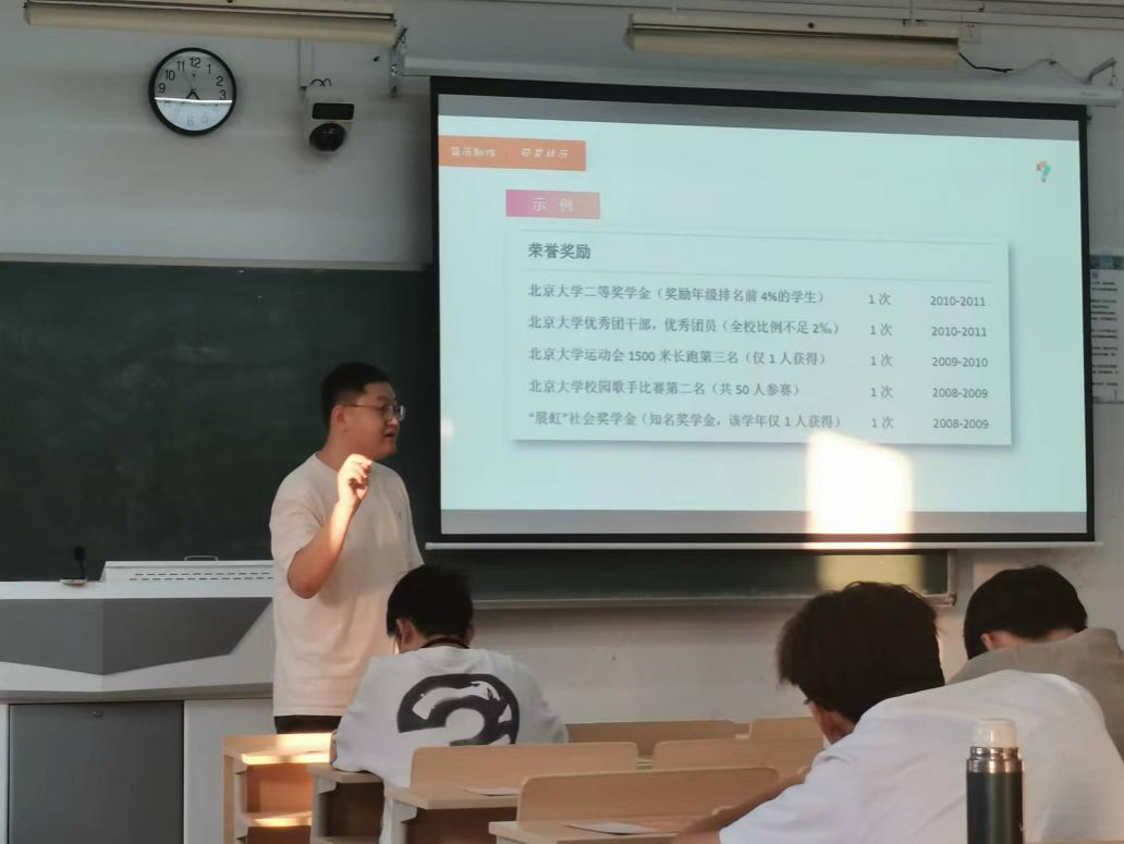 陈老师从面试的基础知识讲起,向同学们介绍了“什么是面试?”以及“为什么要面试?”,然后从“面试前需要准备什么?”这个问题切入,向同学们讲解了面试的流程,同时陈老师从自己作为一个HR的角度,向同学传授了一些面试时可以用到的小技巧。讲座的第二个阶段,陈老师为同学们讲解了简历制作相关的知识,从一个HR的视角入手,对简历各个模块的填写作出了指导与建议,陈老师绘声绘色的讲解让同学们受益良多。