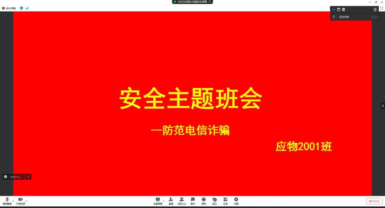为保障同学们的生命财产安全,培养他们的安全意识和自我保护能力,72779太阳集团本研各年级辅导员于十一月针对意识形态安全、实验室安全、消防安全、交通安全、实习实训安全、防范电信网络诈骗、文明用网等方面分别开展了安全教育主题班会。