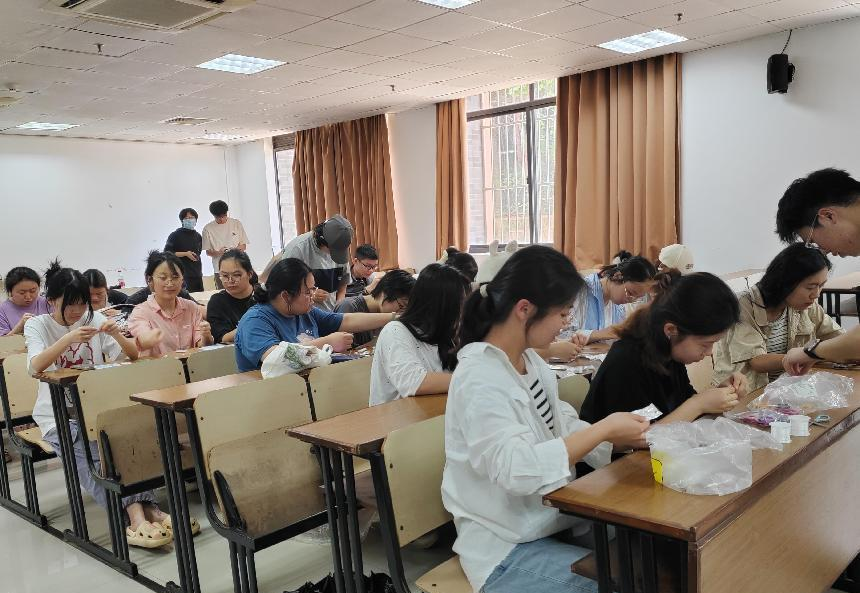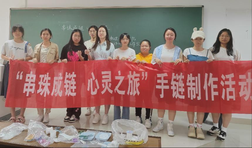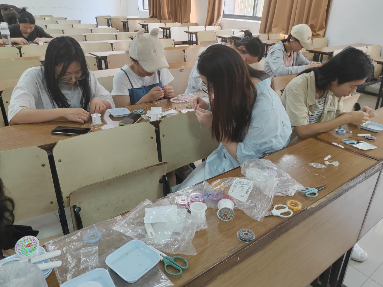 活动现场气氛热烈,同学们纷纷挑选自己喜爱的珠子,通过耐心细致地穿线、组合,将一颗颗珠子串成了独具个性的手链,将自己的情感与愿望融入其中。在串珠的过程中,同学们全身心地投入其中,每一颗珠子的选择与串联都倾注着他们的专注与用心,使他们能够暂时从繁忙的学习和生活压力中抽离出来,让心灵获得了难能可贵的片刻宁静与休憩。同时,大家在相互交流和协作中,分享着彼此的创意和想法,进一步增进了彼此之间的感情,营造出了一种和谐、温暖、积极向上的良好氛围。这有利于促进同学间关系的融洽,增强集体的凝聚力和向心力,进一步促进心理健康。