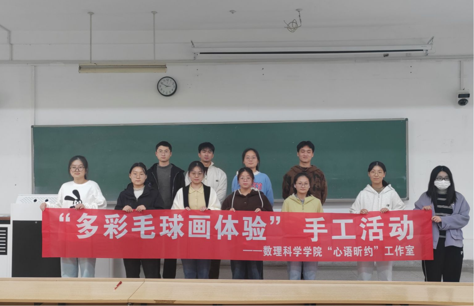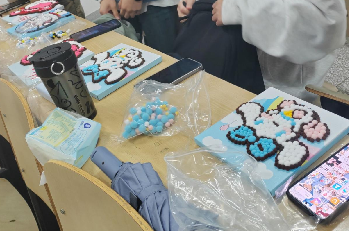 制作毛球画的过程,对心灵来说是一场舒缓而治愈的旅程。当手指与毛球接触,那种毛茸茸的触感仿佛有一种魔力,能驱散心中的烦躁与不安。教室里,同学们正专注于毛球画制作。有的微微歪着头,眼睛紧紧盯着画板,手中镊子灵活地夹起毛球,再稳稳地放到画面合适位置,轻轻按压。有的身体前倾,快速从毛球堆里挑出需要的颜色,有条不紊地排列。在挑选颜色、排列组合的过程中,注意力完全被眼前的画面所吸引,同学们平日里那些萦绕在心头的琐事和压力都被抛到了九霄云外。每完成一小部分,心中就会涌起一种满足感,就像在荒芜的心原上种下了一朵盛开的花。这种专注于创造的过程,让心灵获得了难得的宁静,仿佛时间都为这美好的瞬间停留,让人感受到一种由内而外的平和与放松,如同在喧嚣的世界中找到了一处只属于自己的宁静港湾。