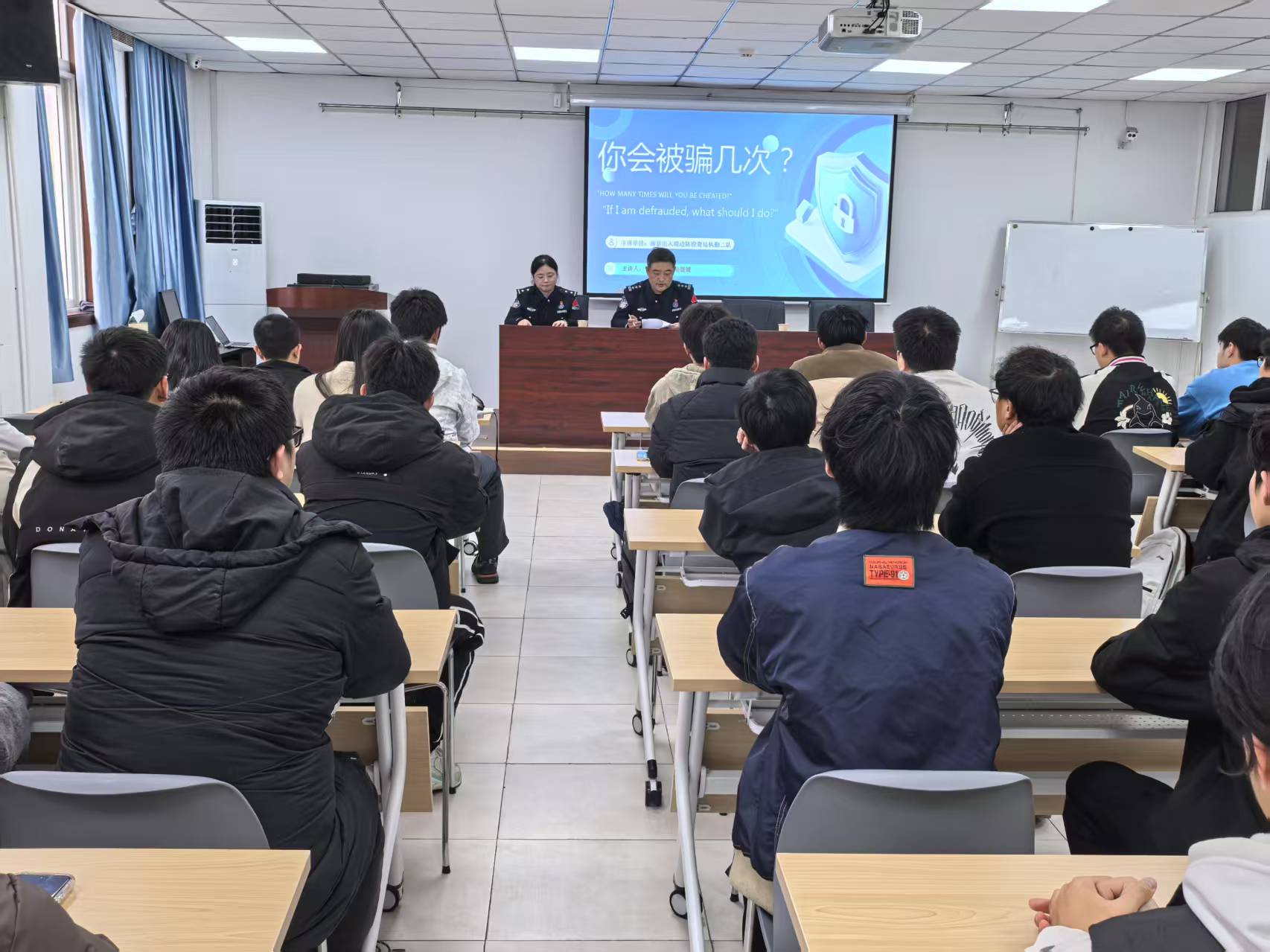 孙振江教导员结合自身丰富的实战经验,系统阐述了电信网络诈骗的定义、发展历程及防范策略。通过剖析典型真实案例与现场互动,展示了电信诈骗的严重性和复杂性,深入浅出地传授了防骗技巧,有效提升了同学们的反诈安全意识和防护技能。