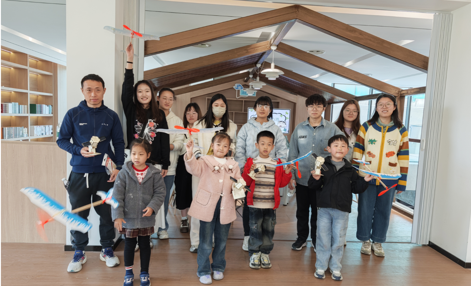 本次科普活动的主要内容为制作DIY卫星模型和橡皮筋动力滑翔飞机,志愿者先用简洁和巧妙的介绍方式为孩子们介绍了产品的实验原理和组装步骤,随后为每个小组分发了实验材料。在志愿者们的帮助下,孩子们通过合作制作了简易版的滑翔飞机。在这次活动后,孩子们都表示很喜欢这次活动,也很喜欢做实验的过程,纷纷向志愿者们表示希望下次还能开展类似活动,并且对滑翔机的工作原理有了更加详细的了解。