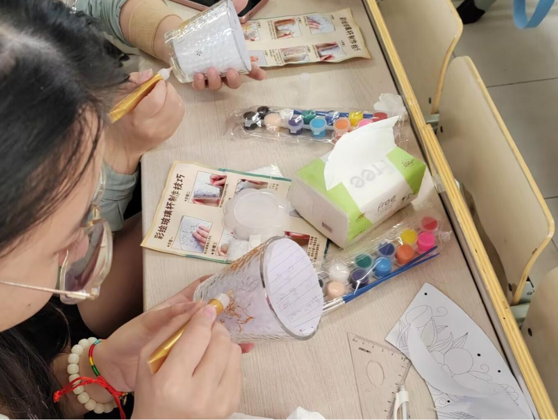 活动伊始,工作人员强调了活动的创意与放松性质,鼓励同学们抛开压力,尽情享受创作的乐趣。活动现场准备了玻璃杯、颜料、画笔等工具,并提供了丰富的参考书籍和图片素材,帮助参与者激发灵感。在轻柔愉快的音乐氛围中,同学们自由选择绘画主题,运用色彩搭配技巧,创作出独具个性的作品。活动还特别设置了成果展示环节,大家相互欣赏、交流创作心得,分享背后的故事,现场氛围温馨而热烈。参与者纷纷表示,此次活动不仅让他们体验到了手工艺术的魅力,还收获了成就感和幸福感。