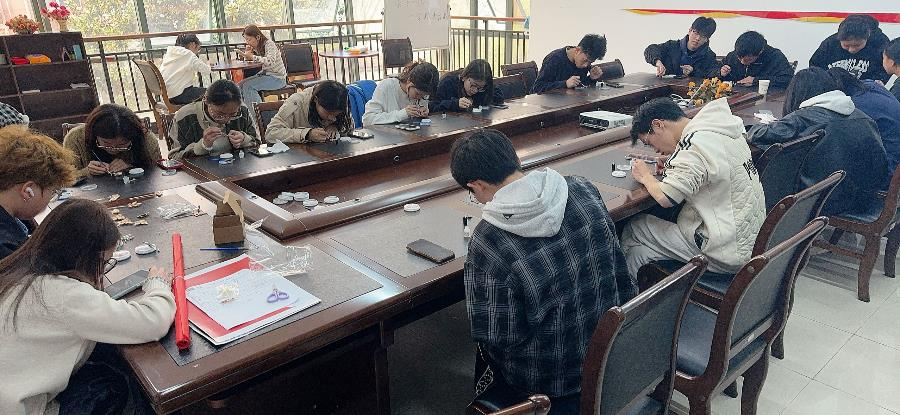 活动现场氛围温馨热烈,各类胸针制作材料整齐摆放、一应俱全:晶莹的螺钿片、精致的金属底托、多样的装饰配件、专业的制作工具一应俱全,从简约百搭的基础款到创意十足的个性款,丰富的材料为同学们的创作提供了无限可能。