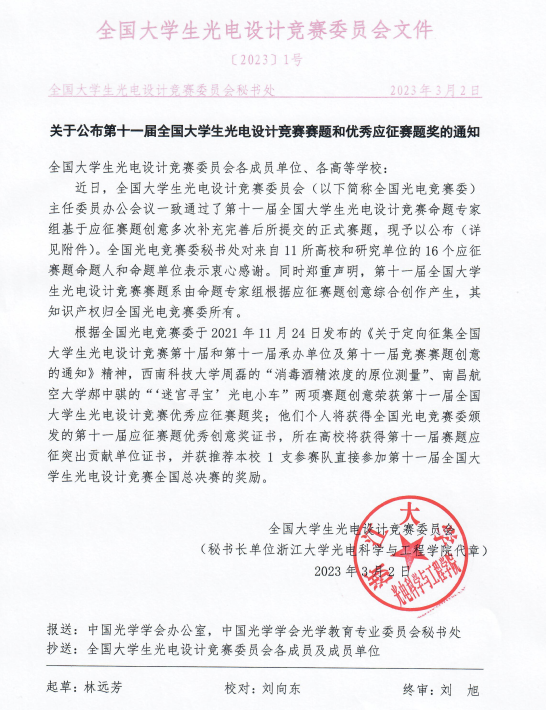 关于公布第十一届全国老员工光电设计竞赛赛题和优秀应征赛题奖的通知